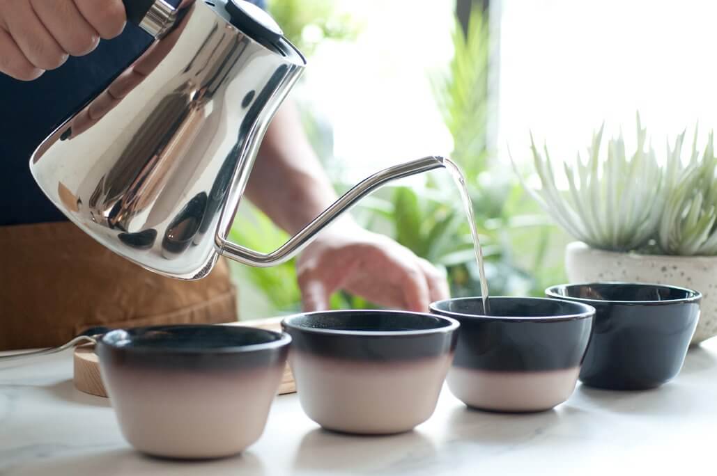 The bowl uses a thermochromic coating that reacts to temperature. It turns white at 95°C, light grey at 70°C, and dark grey at 60°C, providing visual cues for optimal cupping temperatures.